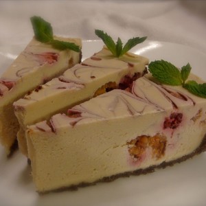 put some raspberries onto the base and pour half of the filling on top